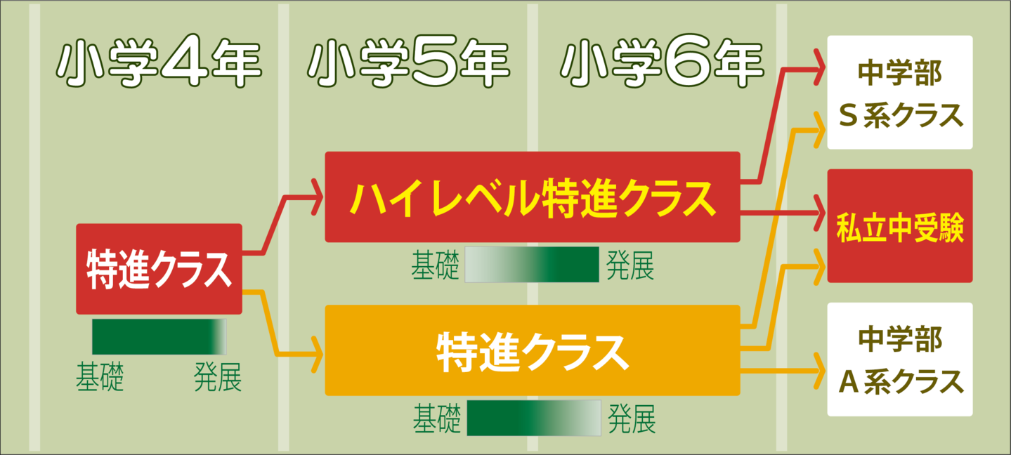 小学4年生からスタートする「特進クラス」は学習習慣の確立から応用思考力の開発までをじっくりと育成。小中一貫指導で文理学科を含む公立上位校進学を目指します。一部の中学受験にも対応します。